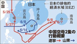 ⇦ 防衛省が発表した中国空母2隻の行動概要